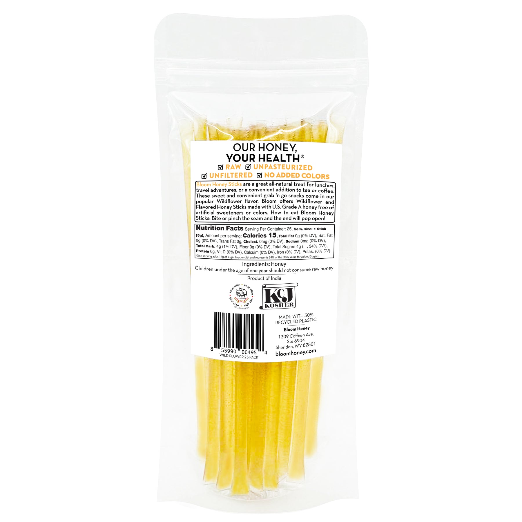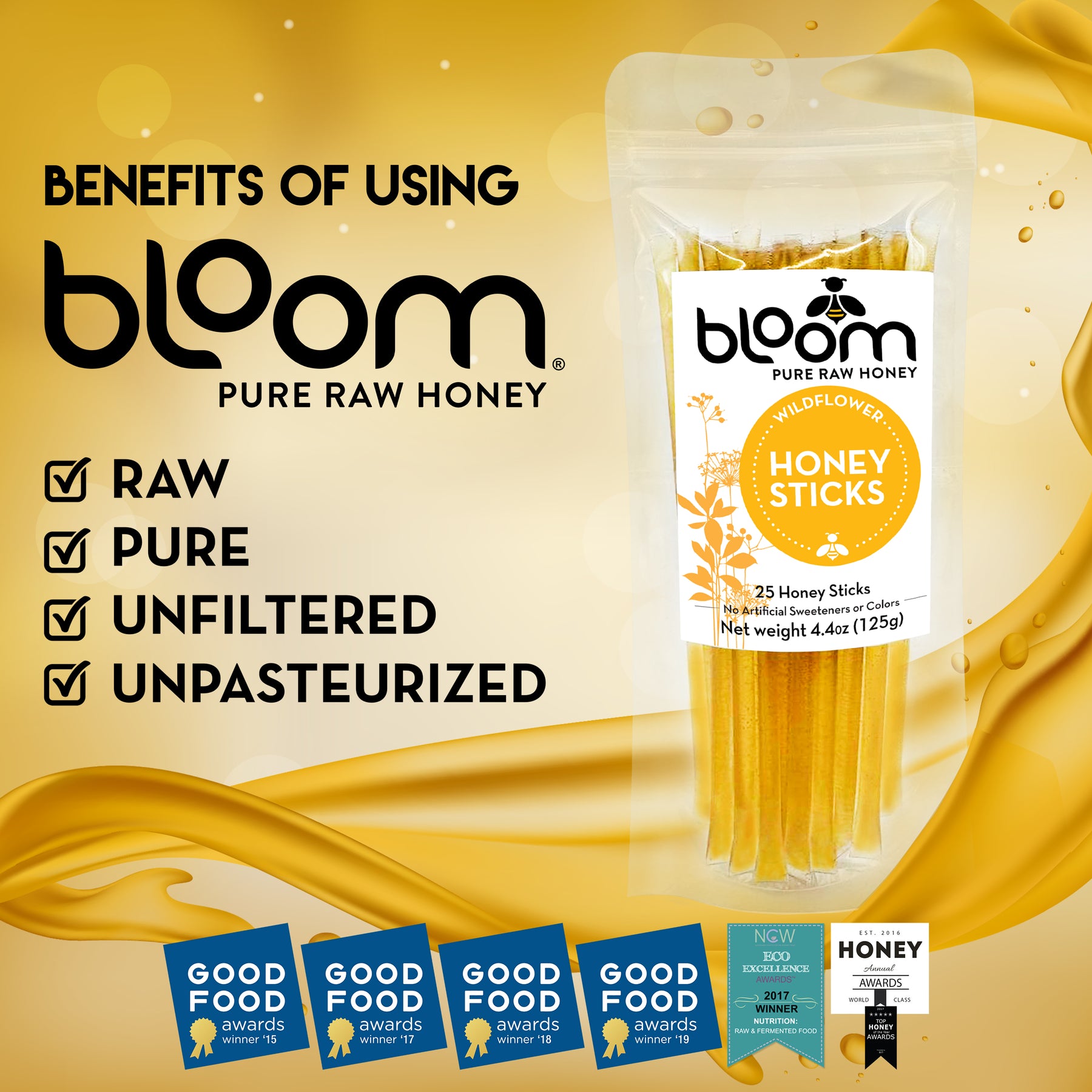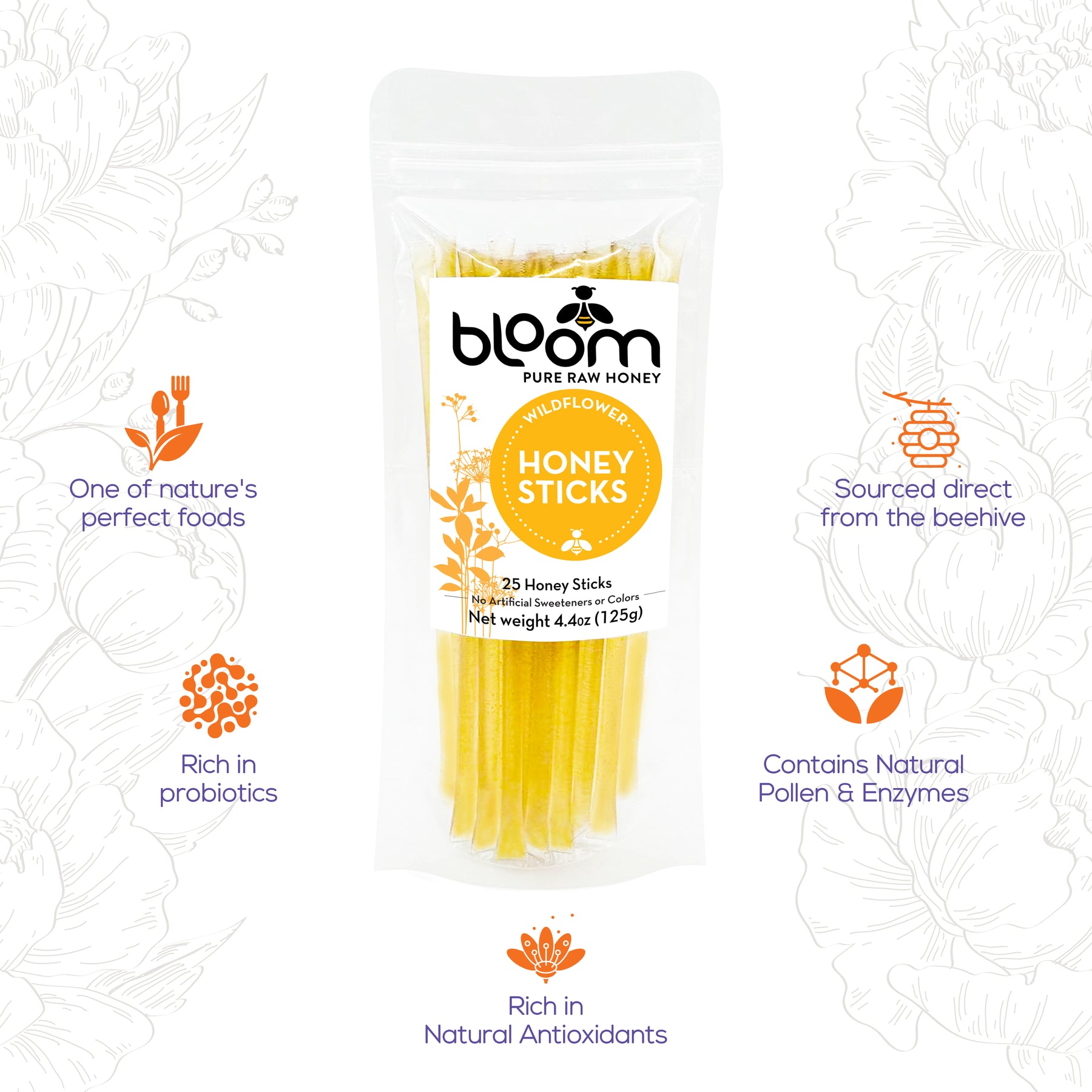 Bloom Honey Sticks are a great all-natural treat for lunches, travel adventures, or a convenient addition to tea or coffee. These sweet and convenient grab 'n go snacks come in our popular Wildflower flavor. Bloom offers Wildflower and Flavored Honey Sticks made with U.S. Grade A honey free of artificial sweeteners or colors. How to eat Bloom Honey Sticks: Bite or pinch the seam and the end will pop open!